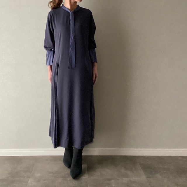 ワンピース 袖プリーツ 配色 長袖 ライトネイビー フリーサイズ【120338】