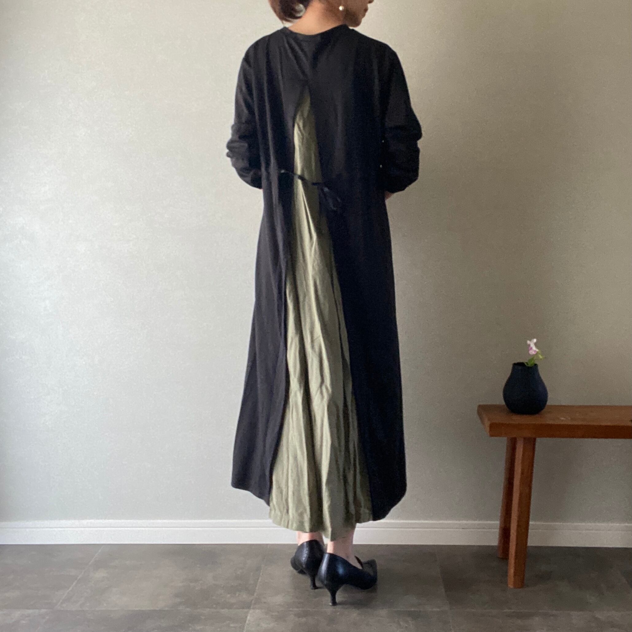 ワンピース 長袖 重ね着風 バックスリット ブラック×カーキ フリーサイズ 【12708010】