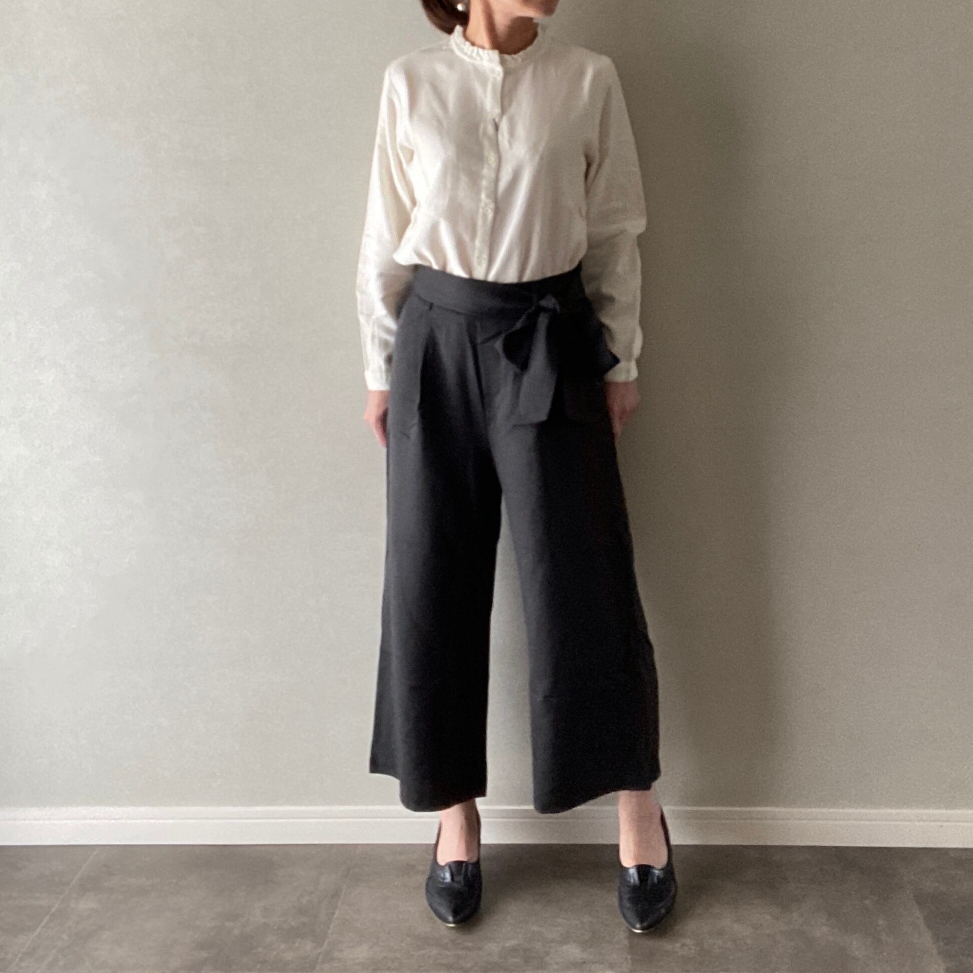 ワイドパンツ リボン付き クロップド 体型カバー ブラック Mサイズ【12909110】