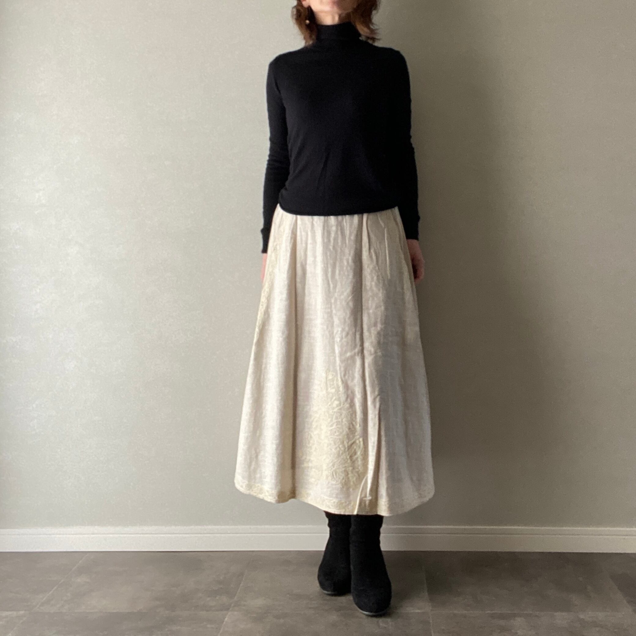 スカート 刺繍 フレア 裏地付き ミドル丈 後ろゴム ベージュ フリーサイズ【12113205】