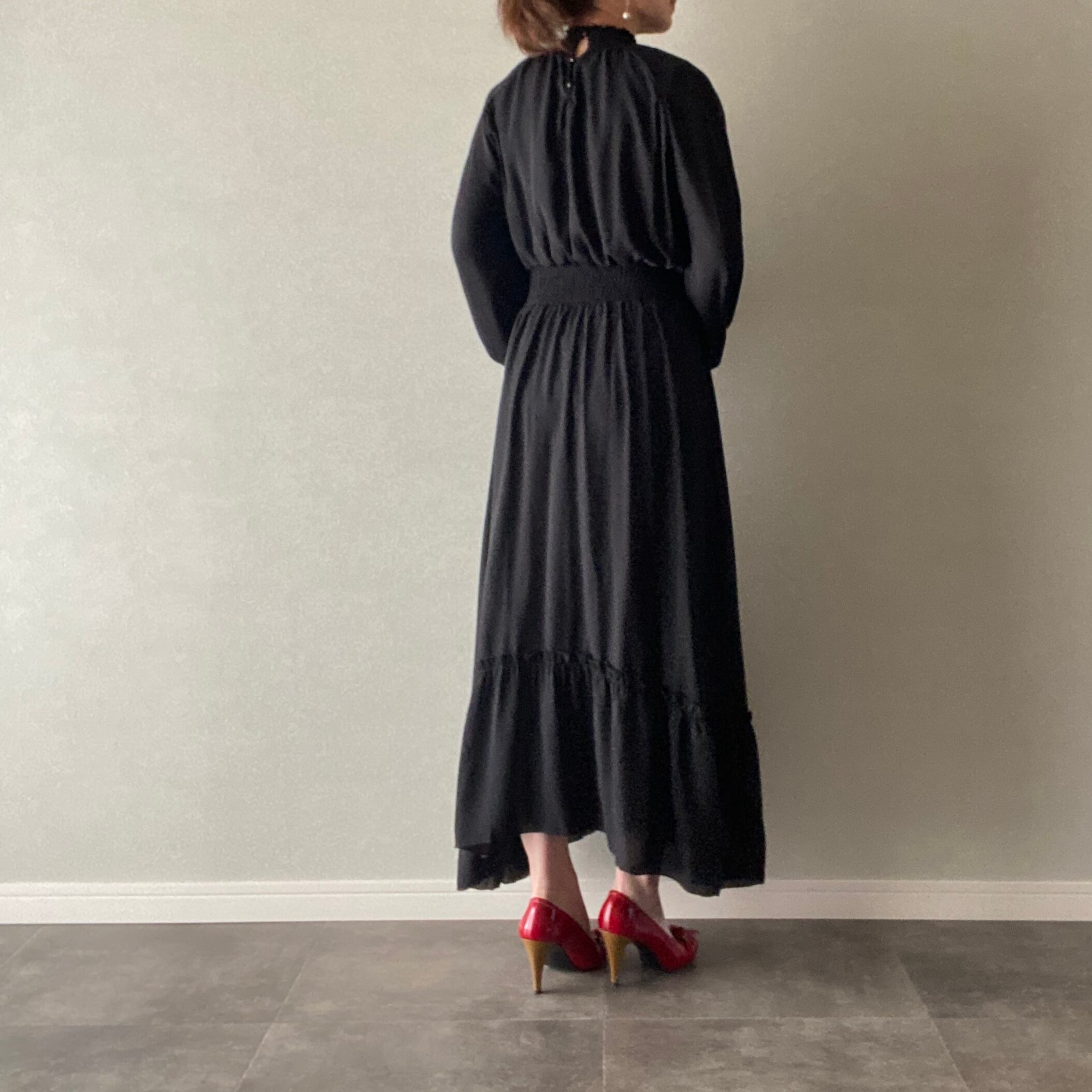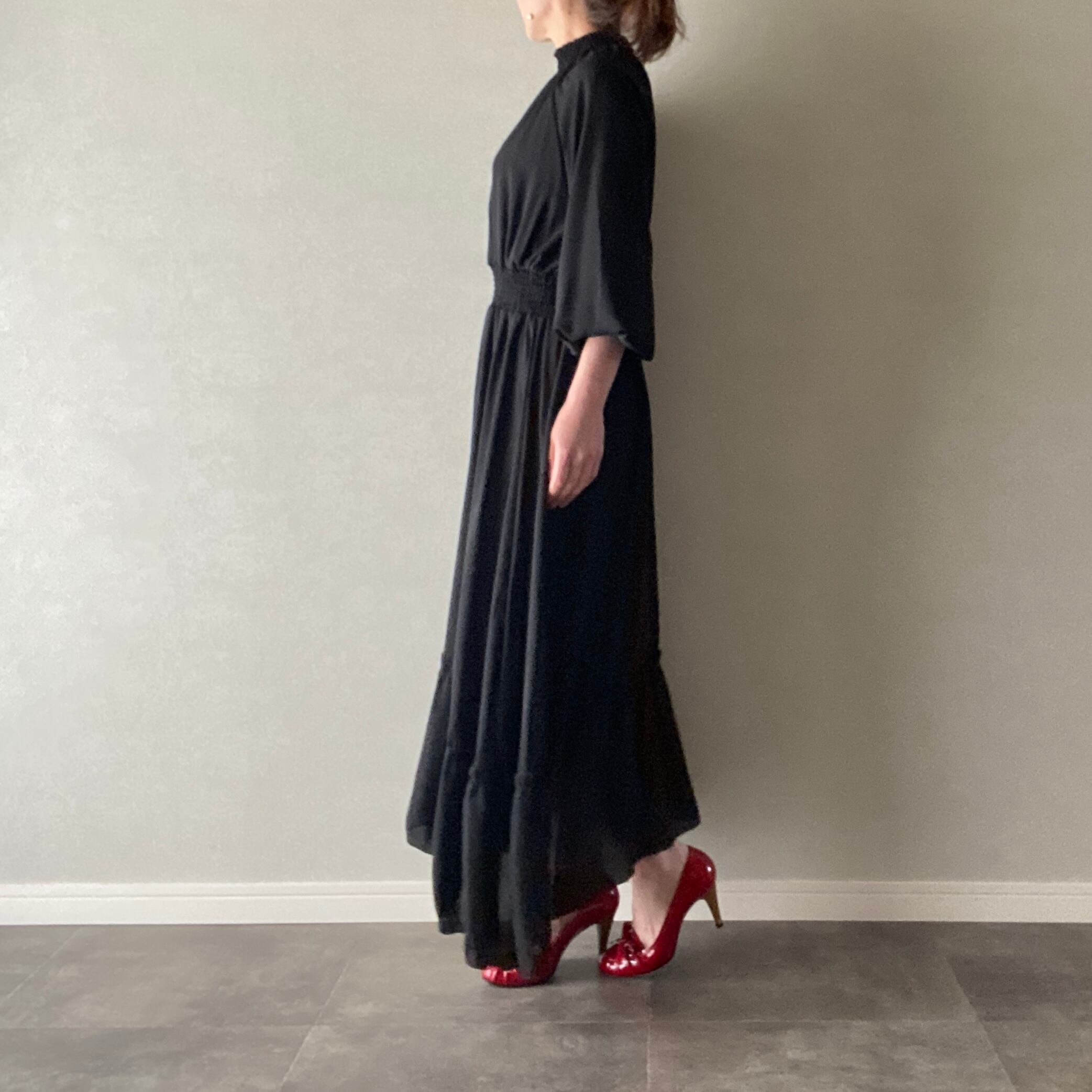 ワンピース 長袖 オシャレ フリル タック 体型カバー ドレス パーティ 二次会 ブラック フリーサイズ 【22309104】