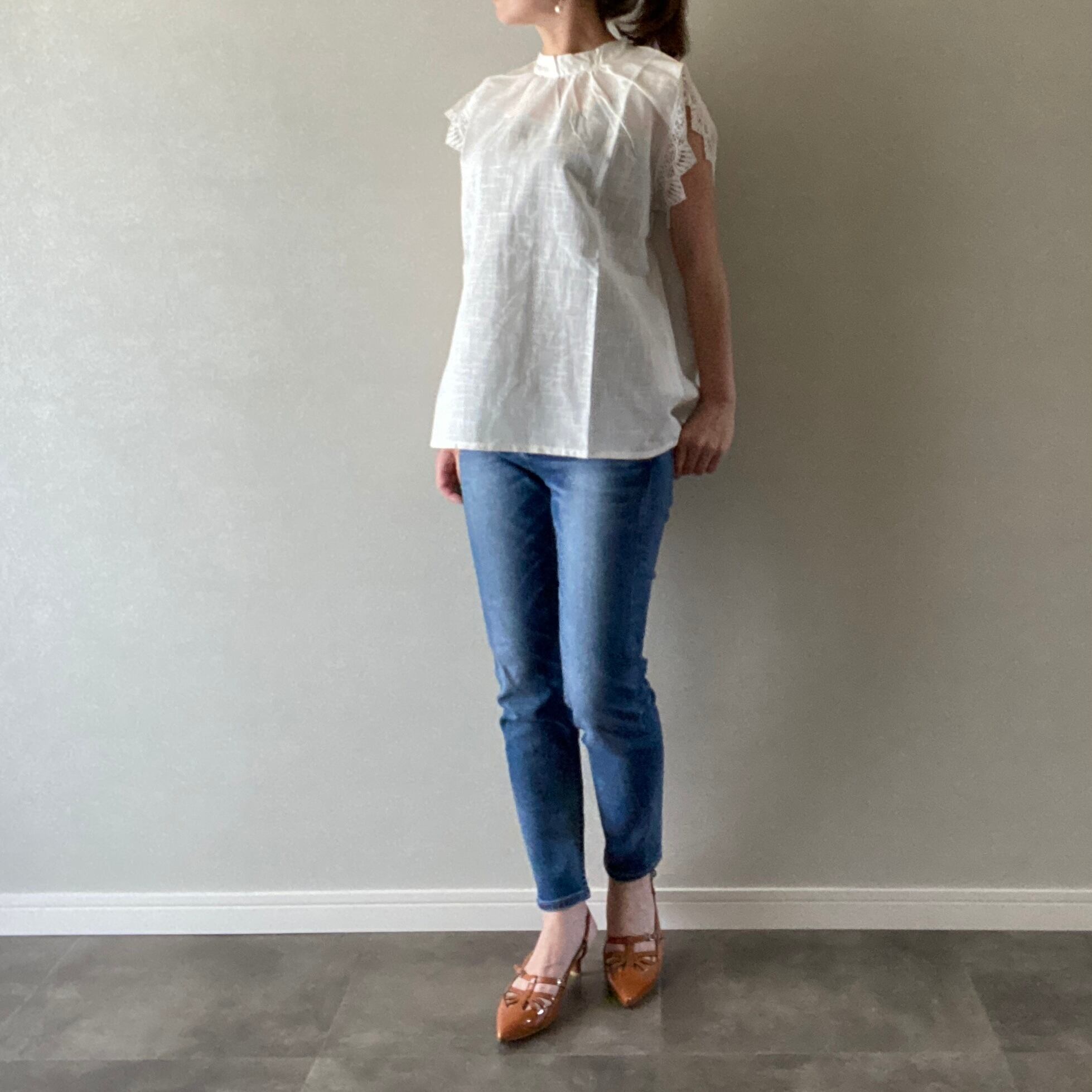 カットソー ブラウス レース袖 スタンドカラー アイボリー M〜Lサイズ 【22508209】