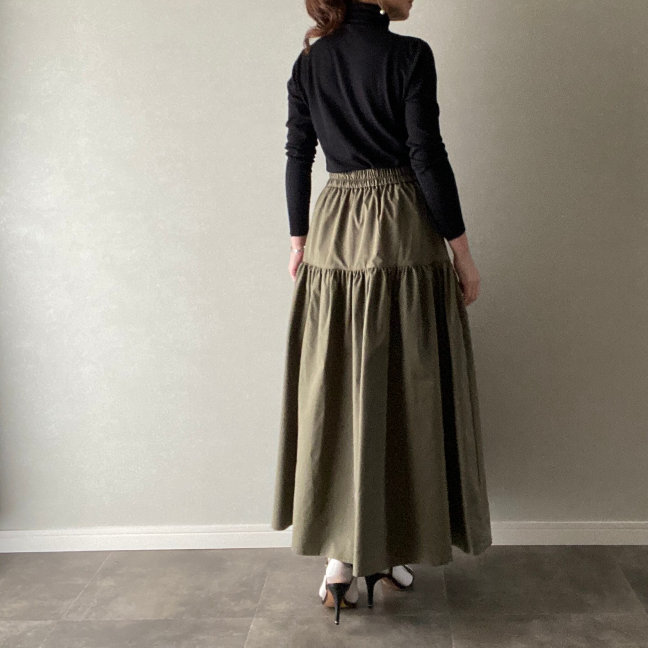 ロングスカート ギャザー ウエストゴム カーキ フリーサイズ【22011204】