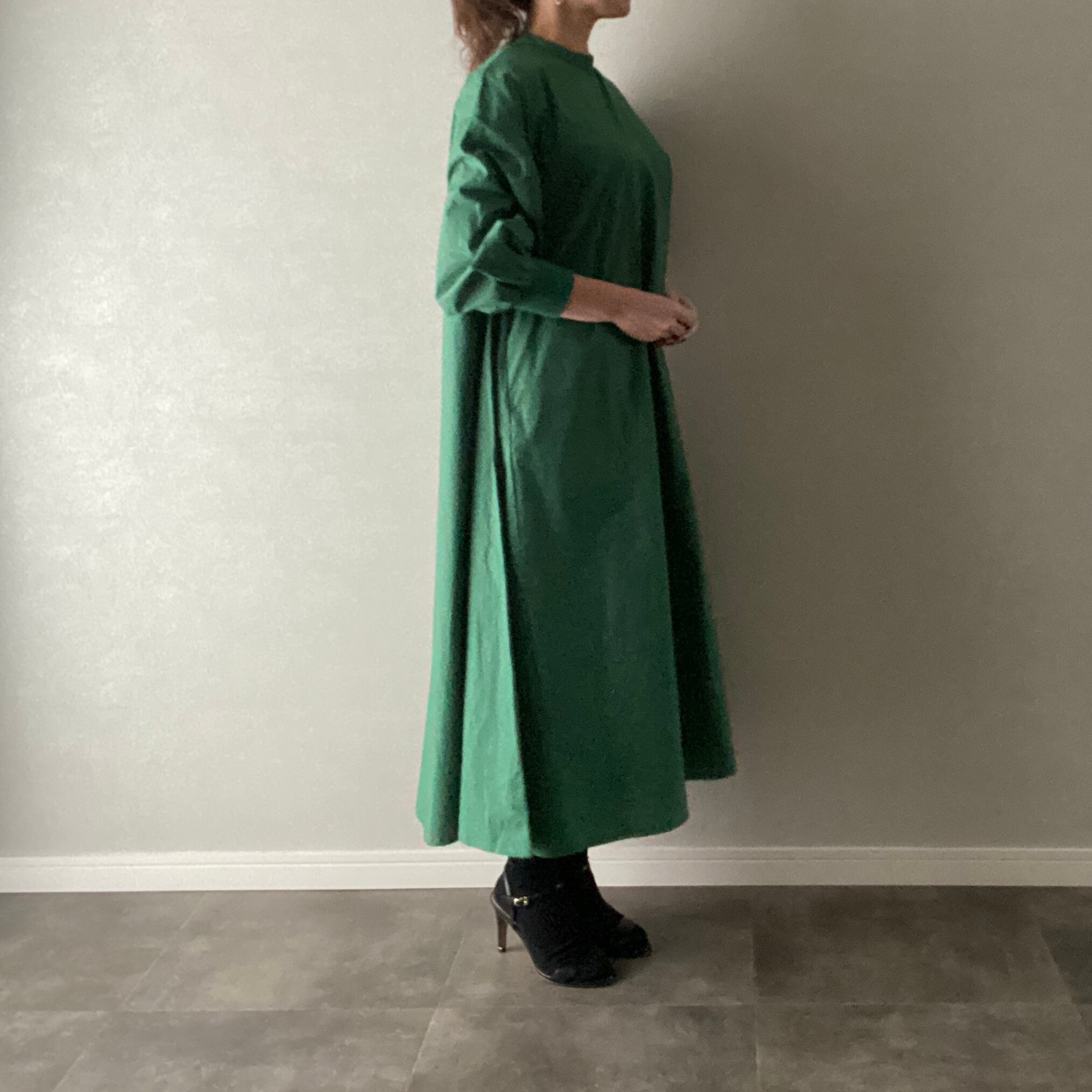ワンピース フレア スタンド襟 リブ袖 グリーン フリーサイズ【22216113】